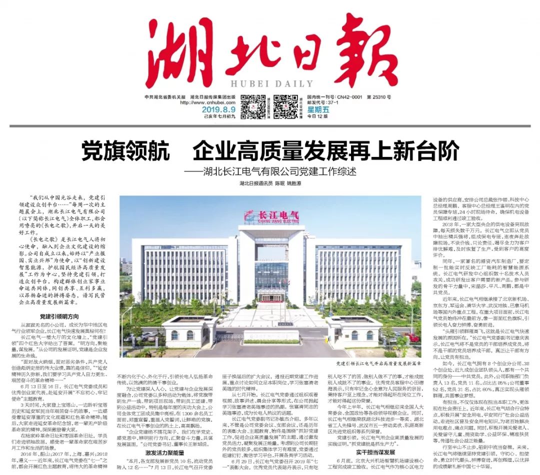 媒体聚焦|今日《湖北日报》头条报道长江电气:党旗引领 企业高质量发展再上新台阶