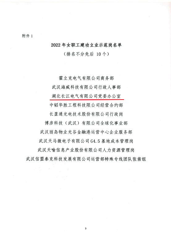 3月3日,武汉东湖高新区光电园总工会发布表彰通知,长江电气党办荣获2022 年度“女职工建功立业示范岗”荣誉称号。